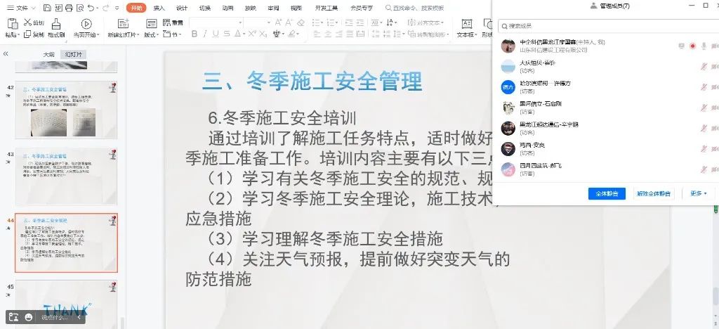 四川分公司组织员工在会议室培训学习冬季施工安全培训。讲师讲解了冬季施工中消防、临时用电、高空作业等安全风险点的防范措施,并组织学员共同复习了施工现场机械管理、消防管理、生活用火用电管理相关操作规范。